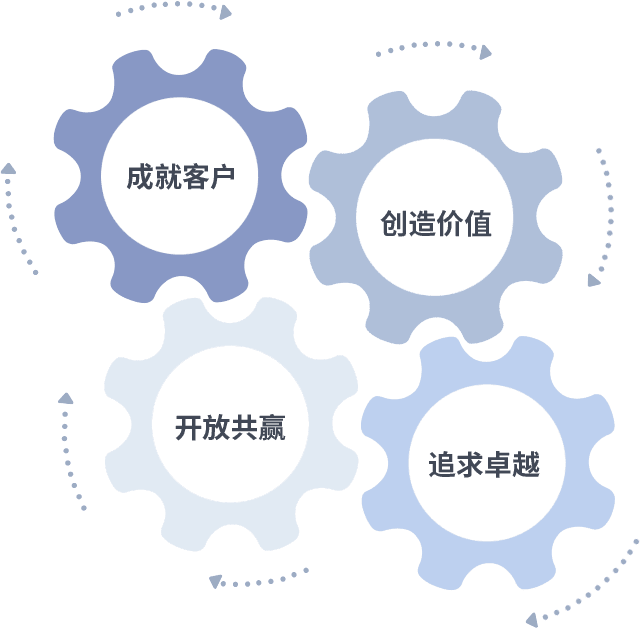 成就客户是一切决策的出发点,,创造价值是衡量所有工作的标准,,追求卓越是我们做事做人的态度,,,开放共赢是我们的格局也是最终的结果。。。。价值观的齿轮环环相扣,,,,推动着组织里的每个人不断向前。。。