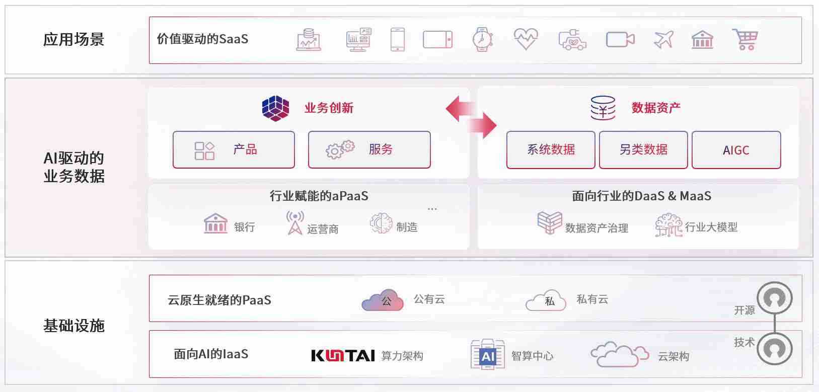 数字时代,,,,围绕企业数字化转型的关键要素,,98858vip威尼斯游戏数码开创性的提出数云融合战略和技术体系框架,,着力在云原生、、数字原生、、AI原生和信创产业上架构产品和服务能力,,,为处在不同数字化转型阶段的快消零售、、、、汽车、、、、金融、、医疗、、、、政企、、教育、、运营商等行业客户提供泛在的敏捷IT能力和融合的数据驱动能力,,,构建跨界融合创新的数字业务场景和新业务模式,,,,助力企业级客户建立面向未来的核心能力和竞争优势,,,,全面推动社会的数字化、、智能化转型升级。。
